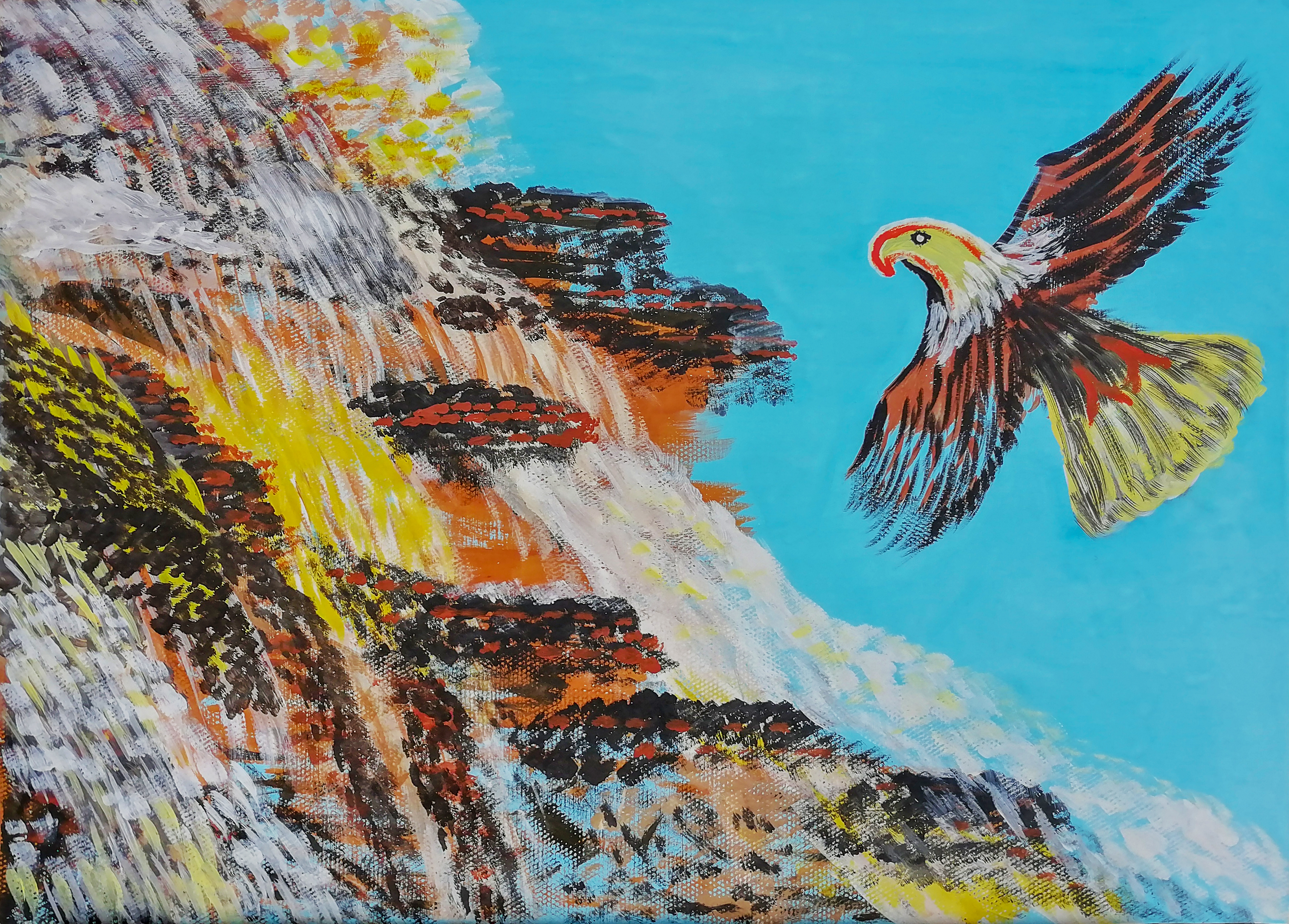 这幅作品视觉冲击力很强,可以看出这位小朋友具有一定绘画功底。小画家画了一只在天空中翱翔的猛禽,大家猜猜是什么猛禽?