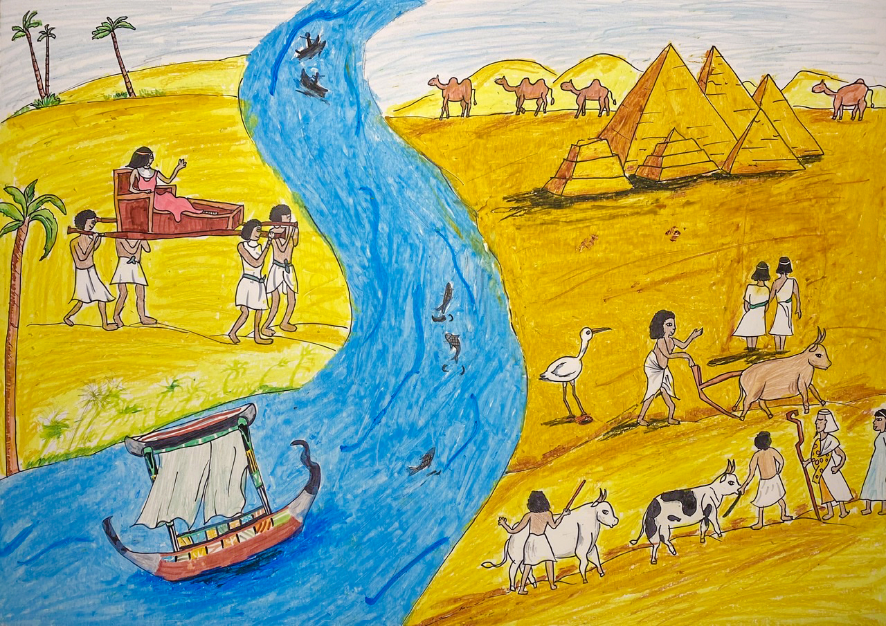 这幅作品画面色彩鲜艳,人物造型生动,构图完整;这是一位9岁小朋友画的尼罗河,小朋友写道:“尼罗河作为世界上最长的河流,孕育了无数的生命。它给沙漠带来生机,给人们带来希望!人类文明因它而绵延留长!”画中人们在河流两岸耕作,远处有金字塔,沙漠,还有一群骆驼。