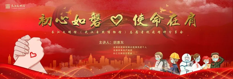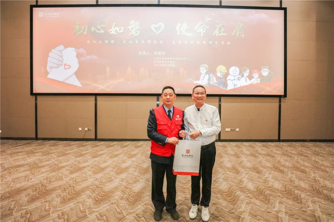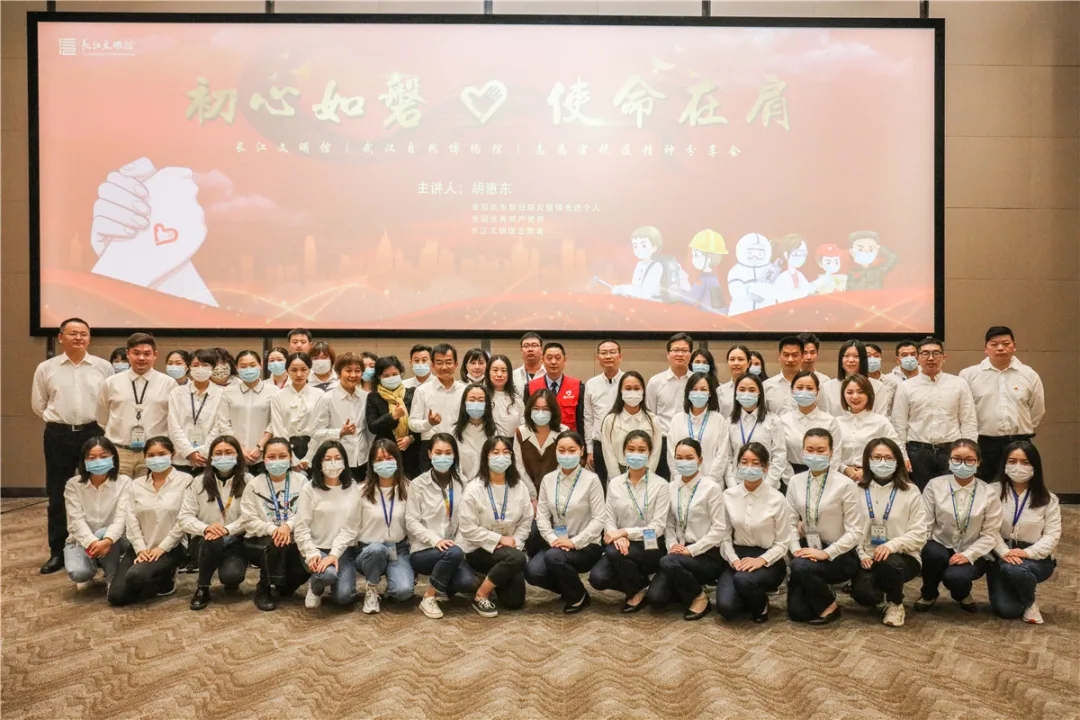 10月28日,长江文明馆(武汉自然博物馆)志愿者抗疫精神分享会在长江文明馆多功能厅举行。全国抗击新冠肺炎疫情先进个人、全国优秀共产党员胡惠东以“初心如磐、使命在肩”为主题,讲述抗疫故事,分享战疫力量。长江文明馆(武汉自然博物馆)馆长叶昌程,长江文明馆经营管理有限公司董事陈修家,副馆长张肖雯、李进出席本次分享会。