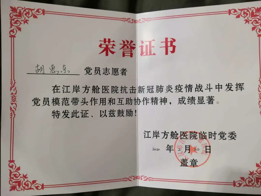 胡惠东是长江文明馆(武汉自然博物馆)的一名志愿者,也是首批加入我馆志愿者团队的优秀志愿者之一。2020年,一场突如其来的新冠疫情让湖北和武汉按下“暂停键”时,湖北省有120万名志愿者挺身而出,胡惠东就是其中一分子。面对突如其来的新冠疫情和生死攸关的重大考验,胡惠东勇敢逆行,除夕之夜主动请战,成为全市第一批交通运输志愿者,为众多患者扬起“生命之帆”;他践行初心,积极申请成为第一批下沉社区的志愿者,为“围城”中的困难群众雪中送炭;不幸感染后住进方舱医院,他以革命乐观主义精神对抗病毒,积极加入方舱医院临时党支部和志愿团队,他不计个人安危,牢记党员宗旨,尽心竭力为民服务。