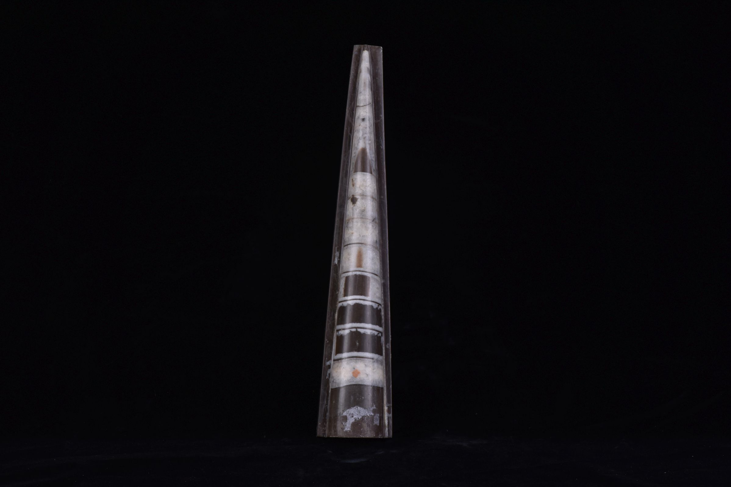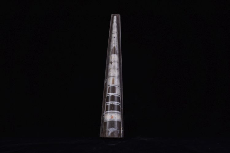 震旦角石是海洋中凶猛的食肉性动物化石。其主要产自我国的湖北、湖南等地区的奥陶纪地层。 震旦角石具有坚硬的外壳,壳体或直或盘卷,壳体表面有波状横纹,壳内有很多横板,体管细小,位于中央,也有相当一部分角石体管偏于一侧。当沿其正中的纵切面剥开时,由于梯板的分隔,整体呈宝塔状或竹笋状。壳长可达二米以上,多数在几十公分至一米之间。