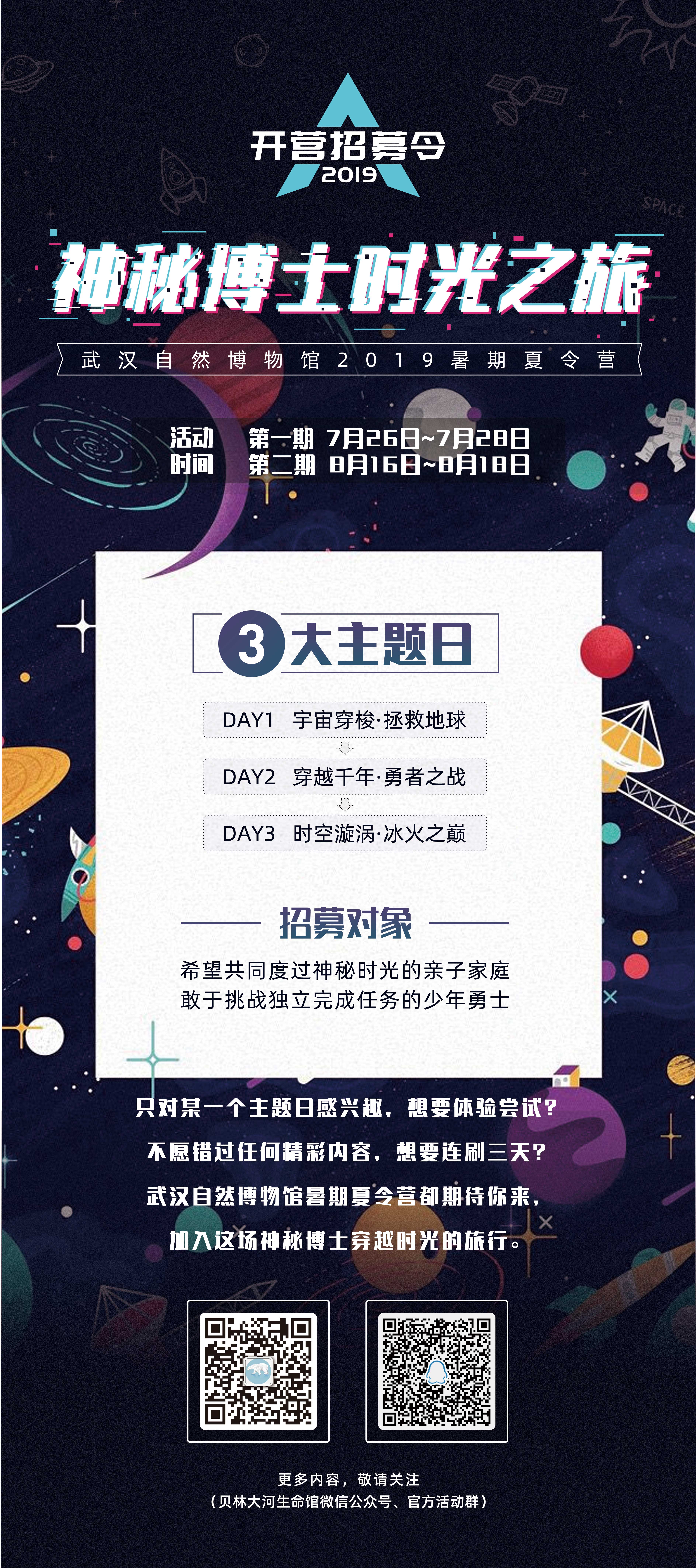 某一天放学回家的你,发现书桌上摆放着一张神秘的邀请函,“神秘博士时光之旅”的字眼赫然映入眼帘,星河宇宙的缩影跃然浮现。这是一封来自宇宙的神秘邀请,你望着邀请函上“确认加入”,郑重地签下了自己的名字……穿越蓝色星球过往的荣耀与黯淡,徜徉在未知和文明的殿堂,来参加武汉自然博物馆暑期夏令营,开启一场史无前例的博物馆之旅吧!