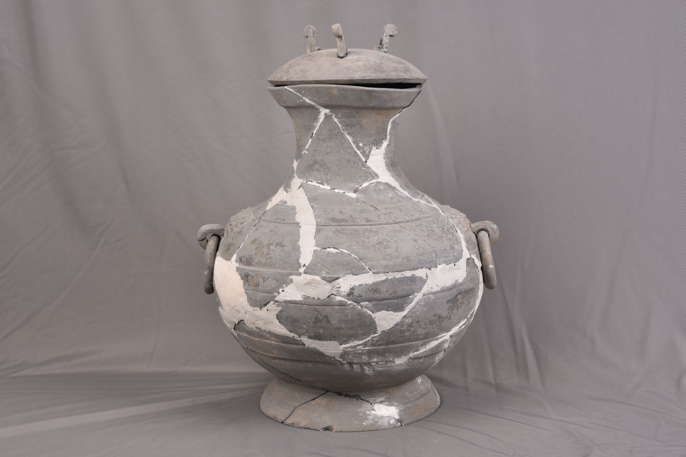 西汉,高44厘米,口径17厘米,腹径30厘米,底径23厘米。泥质,灰陶。轮制。铺首衔环模制。覆钵形盖,弧顶,顶上均匀分布三钮。器身盘口微敞,方唇,高领,束颈,溜肩,圆鼓腹,圜底,高圈足。 铺首在器身肩部,颈肩部和中腹各饰一道带状凸弦纹。