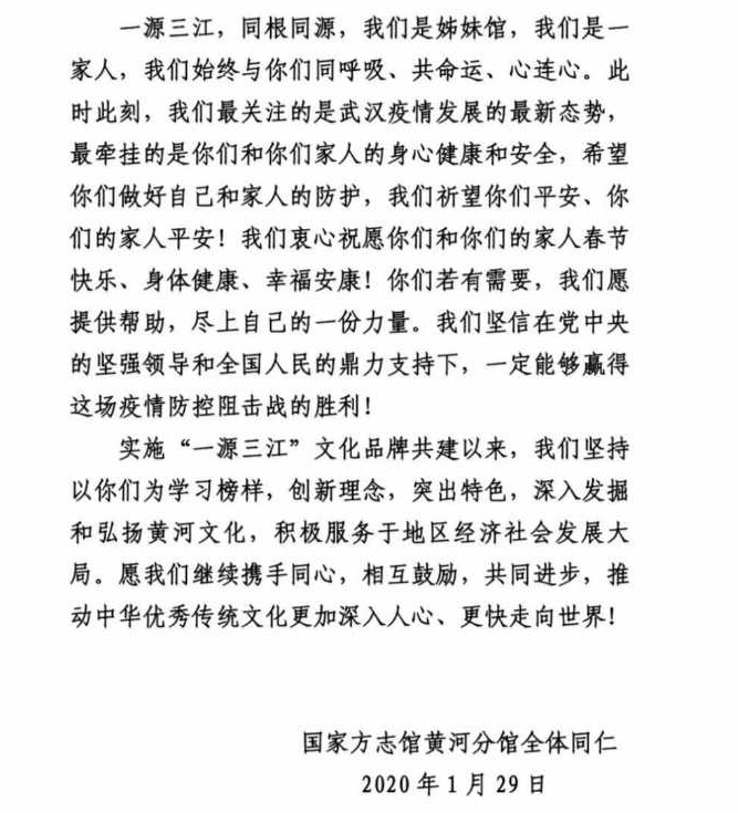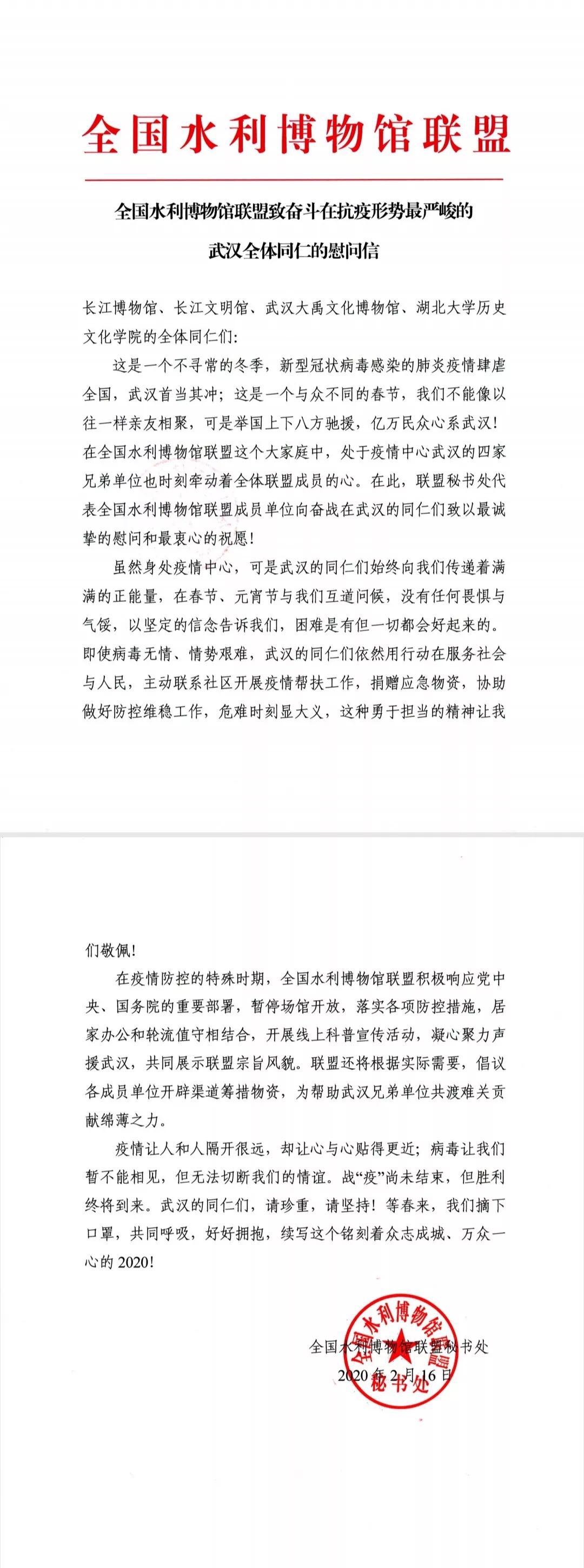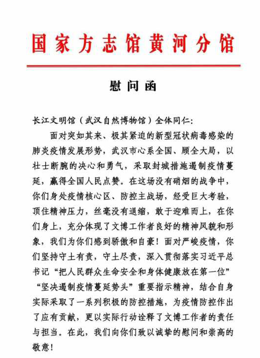 自疫情开始以来,长江文明馆(武汉自然博物馆)陆续收到各界同仁的关心与慰问:中国文物信息咨询中心在武汉封城当天即发来慰问函,函中“中心广大干部职工永远是你们的坚强后盾,永远与你们在一起”令人动容;国家方志馆黄河分馆在慰问函中写道“一源三江,同根同源,我们是姐妹馆,我们是一家人,我们始终与你们同呼吸、共命运、心连心”,让身处疫区的全馆上下感受到众志成城的温暖与力量;全国水利博物馆联盟在慰问信中表示,“联盟将根据实际需要,倡议各成员单位开辟渠道筹措物资,为帮助武汉兄弟单位共渡难关贡献绵薄之力”,让我们更具战胜这场疫情的信心。